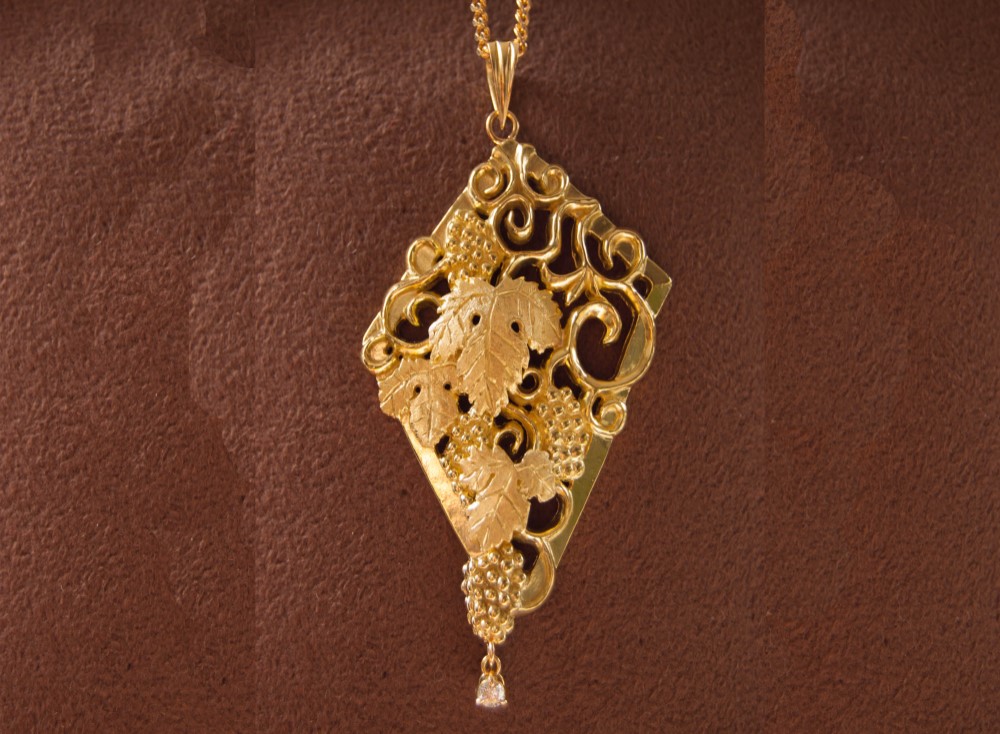18金イエローゴールドを贅沢に使用した、葡萄唐草ペンダントトップです。 ペンダントトップのみ、チェーンは付属しておりませんので、ご注意下さい。 私のプロフィールトップ画像で使用しているものと同じ型です。 葡萄の房と葉、ツルが浮き上がるように、ふちの部分を残して くりぬいた作りになっています。 ボリュームとインパクトは、抜群の一品です。 立体感が出るように、葉の部分2枚を別に作り、ロー付けをしました。 ペンダントトップサイズ 縦65位×横40ミリ位(バチカン含む) 天然ダイヤモンド0,1ctを葡萄の房の先端に、揺れるように石留めしてあります。 こちらの商品は、受注制作とさせていただきます。 ご注文、お支払い後、3週間程お時間いただきます。 地金相場により価格が変動することがございます。 宜しくお願いいたします。 その他、ダイヤ無しでのご注文もお受けいたします。 ダイヤ無し 価格¥280,000前後 お気軽にご相談下さい。 |
